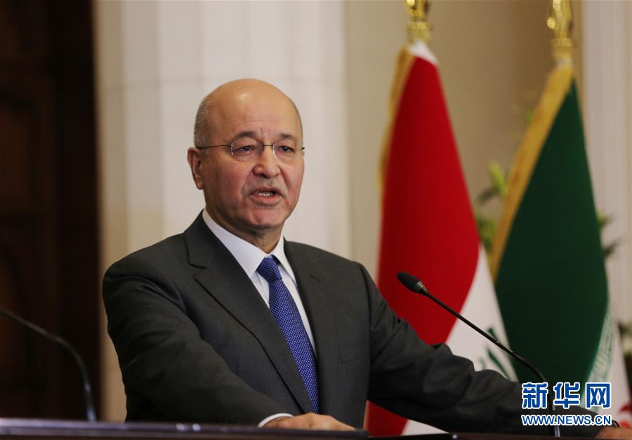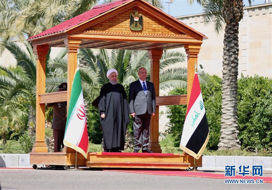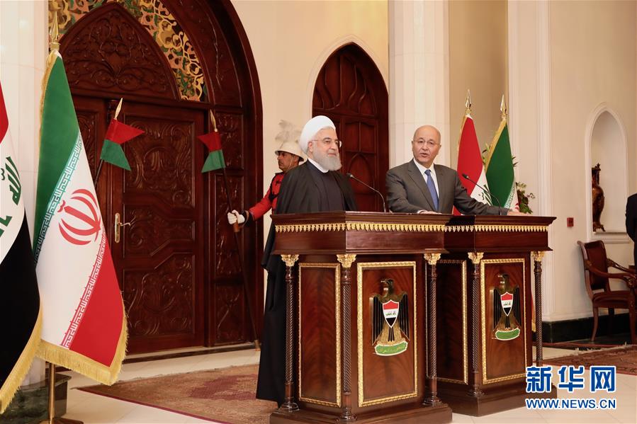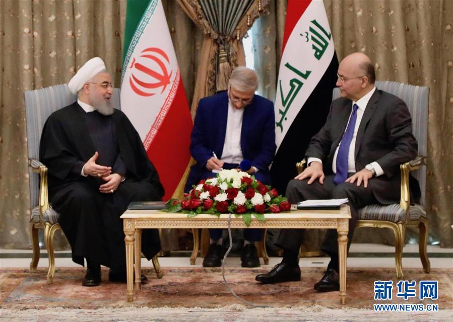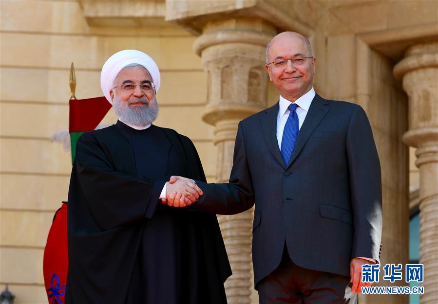3月11日,在伊拉克巴格达,伊拉克总统萨利赫(右)与伊朗总统鲁哈尼(左)举行会谈。伊拉克总统萨利赫11日说,实现伊拉克、伊朗和其他中东地区国家的共同安全需要更多合作。萨利赫当天在首都巴格达同到访的伊朗总统鲁哈尼举行会谈,双方讨论了两国边境、水资源、开展石油和天然气合作等议题。 新华社发(哈利勒·达伍德摄)