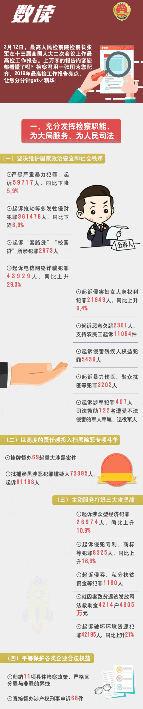 3月12日,最高人民检察院检察长张军在十三届全国人大二次会议上作最高检工作报告。上万字的报告内容您都看懂了吗?检察君用一张图为您配齐,2019年最高检工作报告亮点,让您分分钟get√精华!