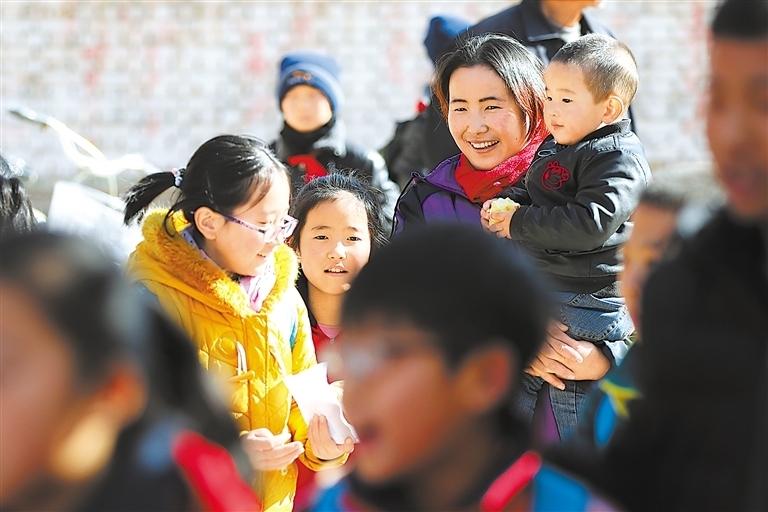中午从“扶贫车间”下班后,黄秀娟在家门口的学校接上孩子一起回家。