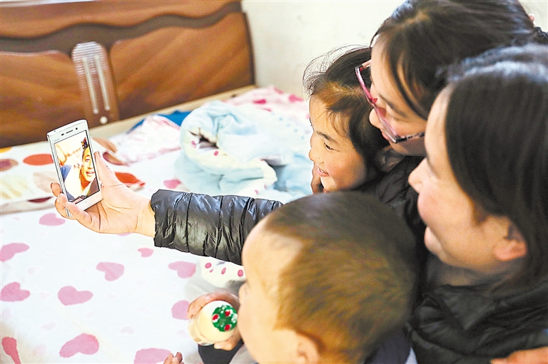 晚饭后,工作了一天的“扶贫车间”女工与在外打工的家人开心聊天。