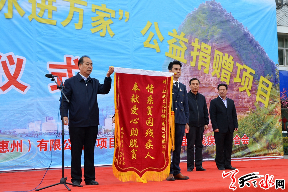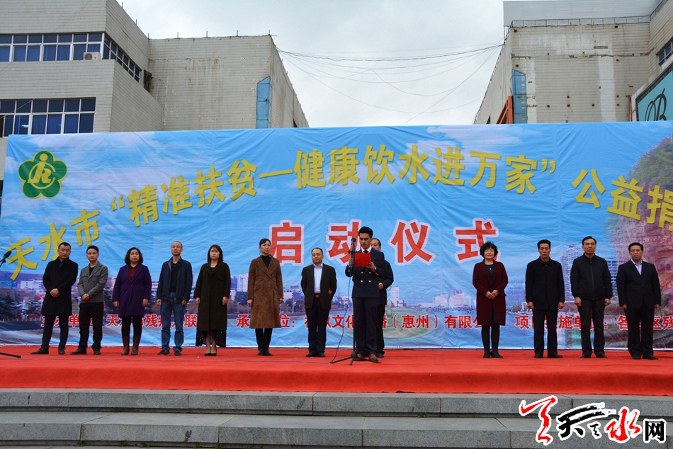 天天天水网讯(全媒体记者 李欣桐 实习生 张茜雅)3月19日,由市残疾人联合会主办,初玖文化传播(惠州)有限公司承办的天水市“精准扶贫—健康饮水进万家”公益捐赠项目启动仪式在龙城广场举行。