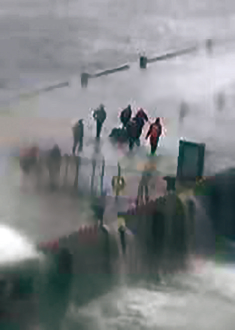 在巨浪的间歇里,他们用叉车推着缆绳一起向码头行进,但风浪一阵猛过一阵,推着叉车根本走不动。大家用同一根缆绳串连起来,共同牵挽,依次抓着缆绳,顶着风浪携手向前,一阵接一阵的狂风大浪不时把人打倒在地,倒下,爬起来,继续前行,再倒下,再爬起来,再前行!每向前一步都异常艰难,每向前一步都更加危险,但没有一个人退缩。