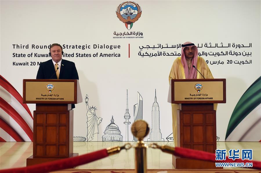 3月20日,在科威特首都科威特城,美国国务卿蓬佩奥出席新闻发布会。科威特副首相兼外交大臣萨巴赫20日表示,作为联合国安理会非常任理事国,科威特将加强与美国在安理会框架内的合作,推动中东地区热点问题的解决。萨巴赫当天与到访的美国国务卿蓬佩奥举行会谈,双方就双边关系以及地区局势交换了意见。 新华社发(阿萨德 摄)