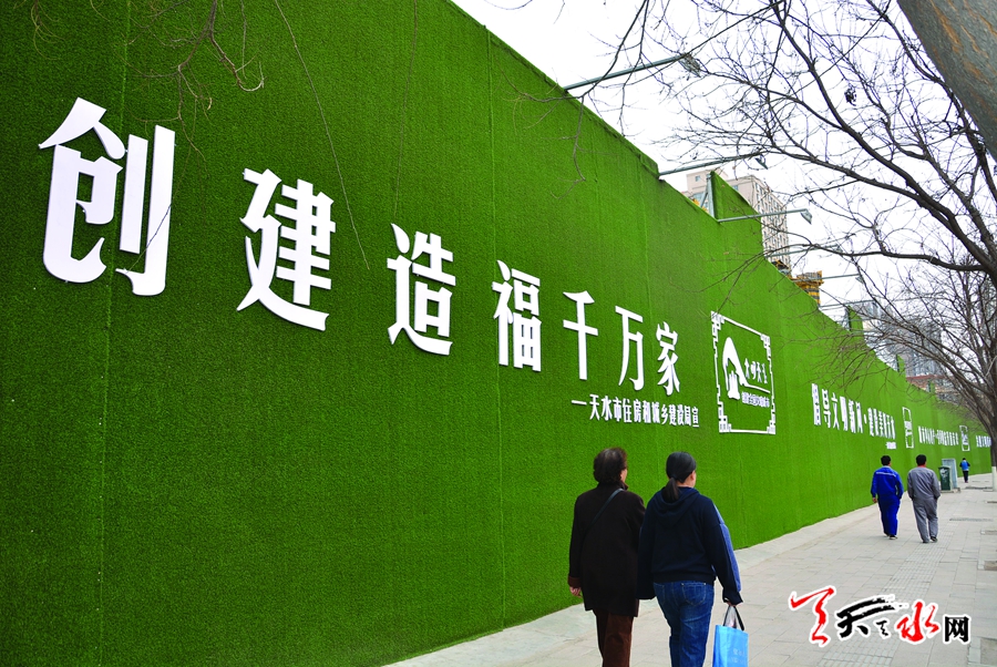 天天天水网讯【记者蔚军平】3月22日,在秦州区合作中路、藉河北路,行人从设置有公益广告的一建筑工地围墙前通过,像这样以绿色草坪布为墙面底色,配以白色文字和图案的公益广告的建筑工地围墙,在我市将会越来越多。