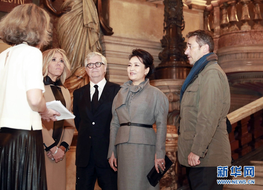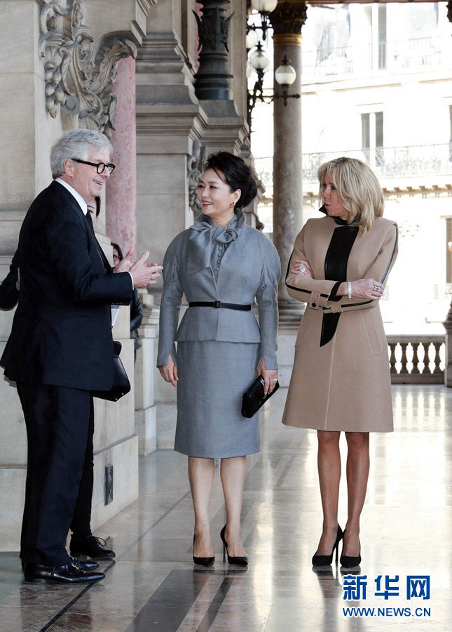 当地时间3月25日,国家主席习近平夫人彭丽媛在法国总统夫人布丽吉特陪同下参观位于巴黎市第九区的法国巴黎歌剧院。 新华社记者 丁林 摄