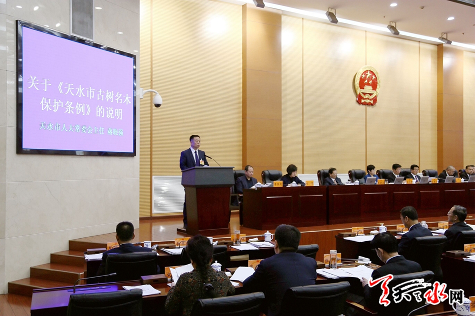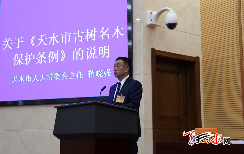 天天天水网讯【全媒体记者马放】3月26日,省十三届人大常委会第九次会议听取和审议了《天水市古树名木保护条例》。会上,市人大常委会主任蒋晓强对我市出台《条例》的必要性、起草和审议过程以及《条例》的基本内容向会议作了说明。