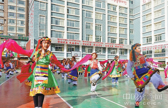 西藏昌都市实验小学的孩子们跳着传统芒康弦子舞改编成的课间操。 经济日报-中国经济网记者 陈 静摄