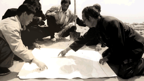 △六老汉之一张润元(右一)等人研究八步沙规划图;后图为八步沙第二代治沙人研究八步沙地图