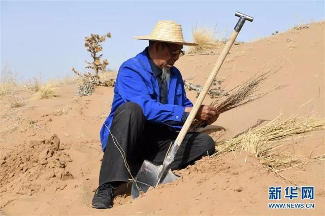 △在甘肃省古浪县八步沙林场,八步沙第一代治沙人张润元补栽花棒苗