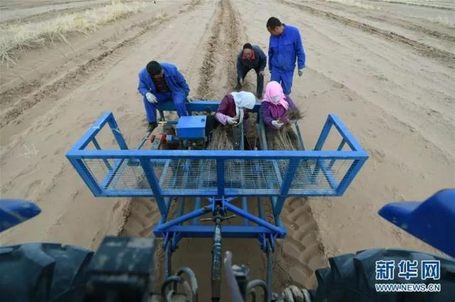 △在甘肃省古浪县黄花滩移民区,八步沙第二代治沙人和村民一起使用梭梭肉苁蓉种植一体机种植梭梭嫁接肉苁蓉