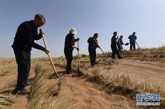 △在甘肃省古浪县境内的黑岗沙风沙口,八步沙第二代治沙人用稻草压沙