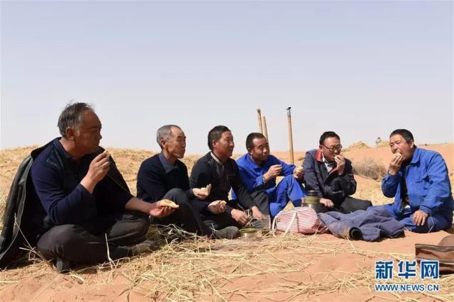 △在甘肃省古浪县境内的黑岗沙风沙口,八步沙第二代治沙人贺中强(左一)、郭万刚(左二)、石银山(左三)、罗兴全(右三)、程生学(右二)、王志鹏(右一)在休息间隙吃午饭