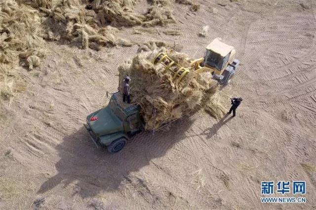 △在甘肃省古浪县境内的黑岗沙风沙口,八步沙第二代治沙人郭万刚(右)指挥装载机往车辆上装载压沙稻草