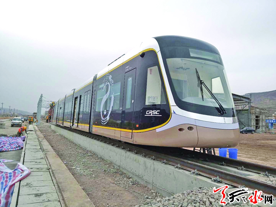 3月30日,记者在天水市有轨电车示范线工程(一期)施工现场看到,一辆由五模块组成的有轨电车停在试车线上,技术人员在车厢内外正忙碌着进行复编组装等工作,不久后将进行通电上线调试,作为甘肃省的首辆有轨电车,计划于2019年11月试运行。