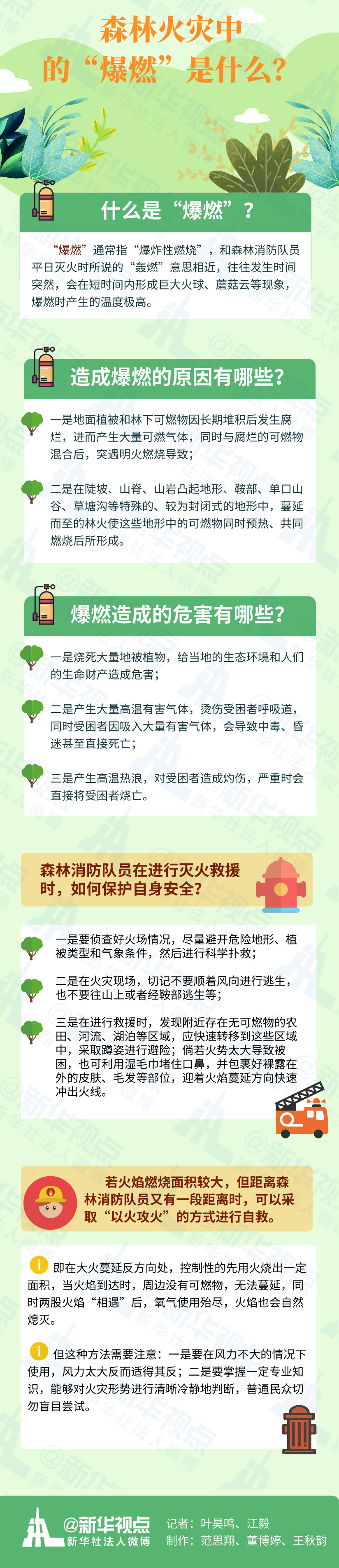 什么是“爆燃”?中国森林消防学科带头人白夜说:“‘爆燃’ 通常指‘爆炸性燃烧’,和森林消防队员平日灭火时所说的‘轰燃’意思相近,往往发生时间突然,会在短时间内形成巨大火球、蘑菇云等现象,爆燃时产生的温度极高。”