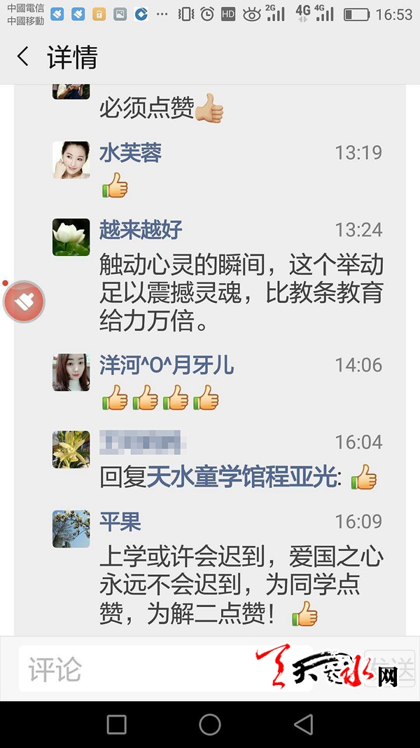 在马校长的朋友圈里,有家长说:“一个迟到的孩子正好赶上升旗仪式,让人感动!好孩子!”也有人点赞:“触动心灵的瞬间,这个举动足以震撼灵魂,比教条教育给力万倍。”“上学或许会迟到,爱国之心永远不会迟到,为同学点赞,为解二点赞!”