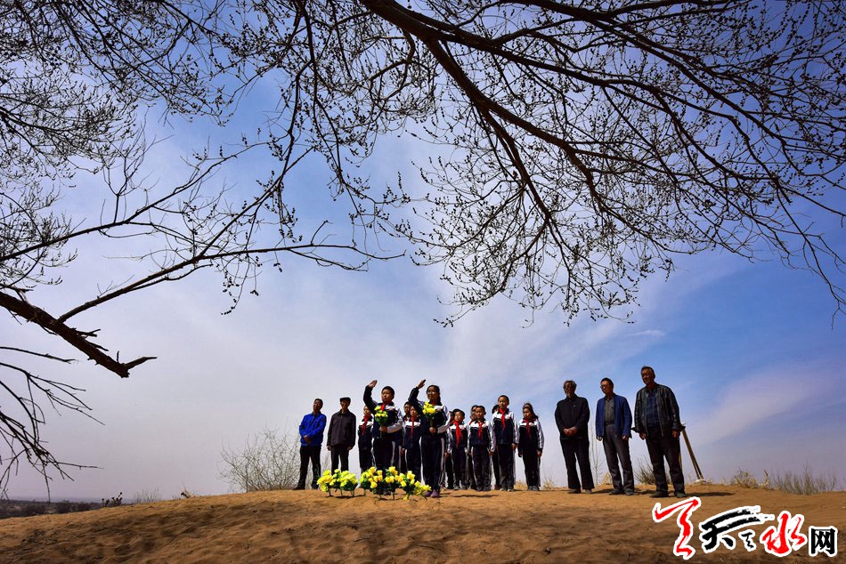 清明节前,八步沙治沙人和学生们在六老汉种植种植近40年的大榆树下,孩子们向八步沙治沙人缅怀致敬。