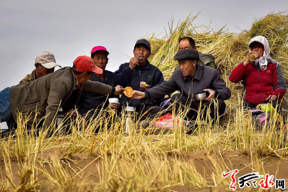 沙漠离家远,古浪县十道沟治沙点,远距离的治沙人从周边聚到一起,在沙窝里分享自带的干粮和水。