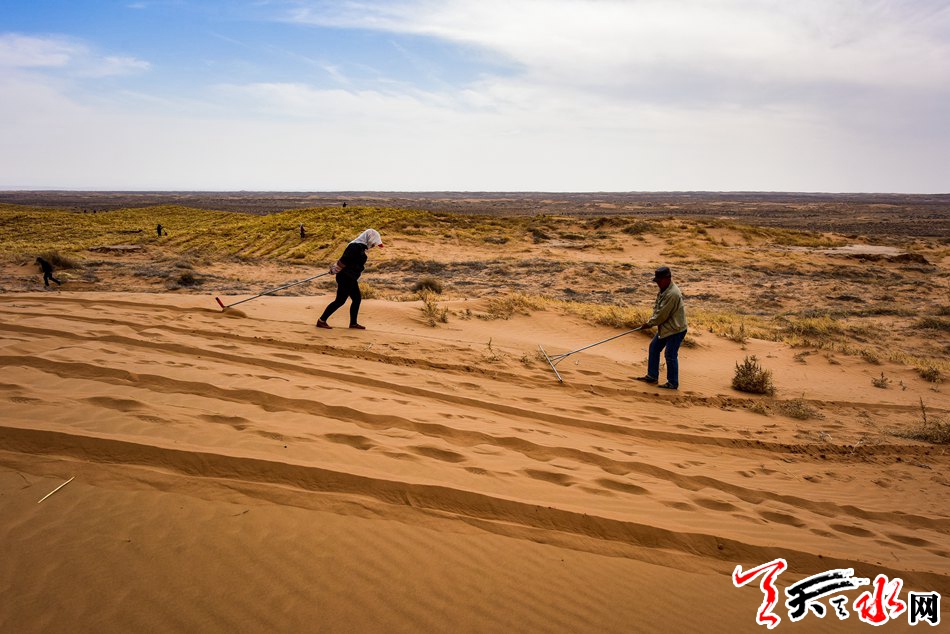 古浪县十道沟治沙点67岁的八步沙第二代治沙人郭万刚每天都来和工人们一起压沙。今年春季,他们计划治沙2万亩,全年计划治沙超过5万亩。