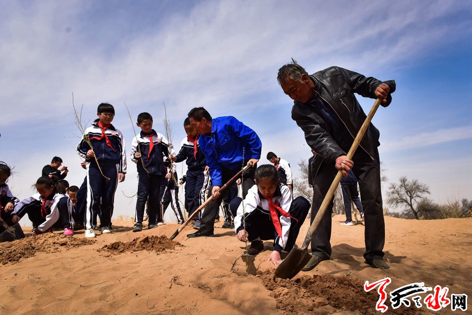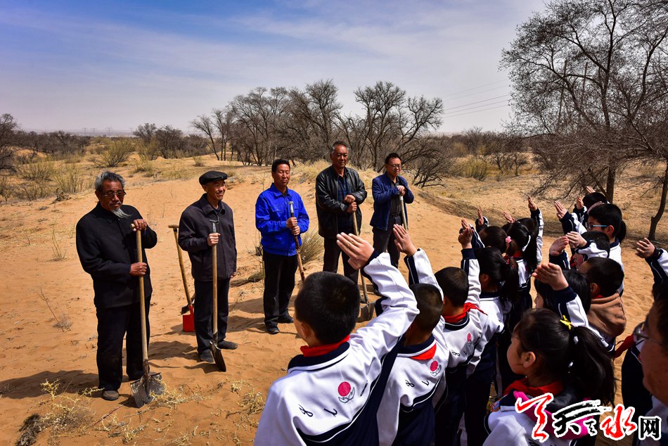 时光流逝,八步沙渐渐变绿,六老汉的头发也白了。但治沙任务还没有完成。老汉们早想到了这一天,他们达成协议,每家人指定一位后人继续治沙,于是就有了第二代、第三代治沙人。图为八步沙第二代治沙人贺中强带领学生植树治沙。