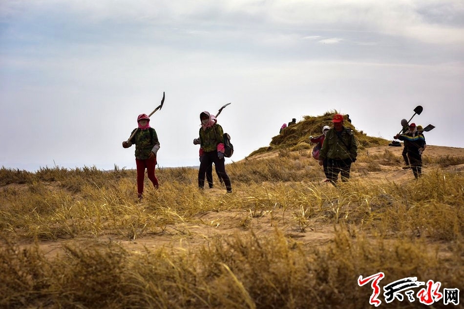 在古浪县11号移民点背后的沙地里,大型机械不断穿梭,工人们正在有条不紊嫁接肉苁蓉。负责这项工作的是第三代治沙人郭玺,沙漠地区强烈的紫外线让他的面庞黑得发亮。他说,“这5000亩梭梭嫁接肉苁蓉能带动近千户贫困户脱贫。”