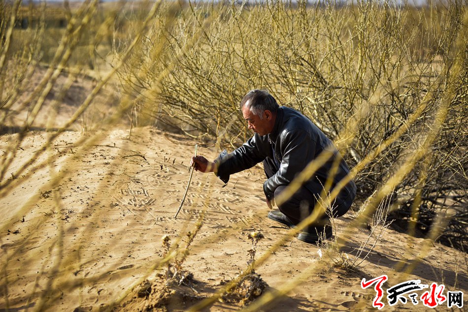 八步沙第二代治沙人贺中强已经治沙28年,仍然奔忙在治沙的第一线。在无垠的沙漠中劳作,贺中强老汉通过在沙地上练书法来排解寂寞。