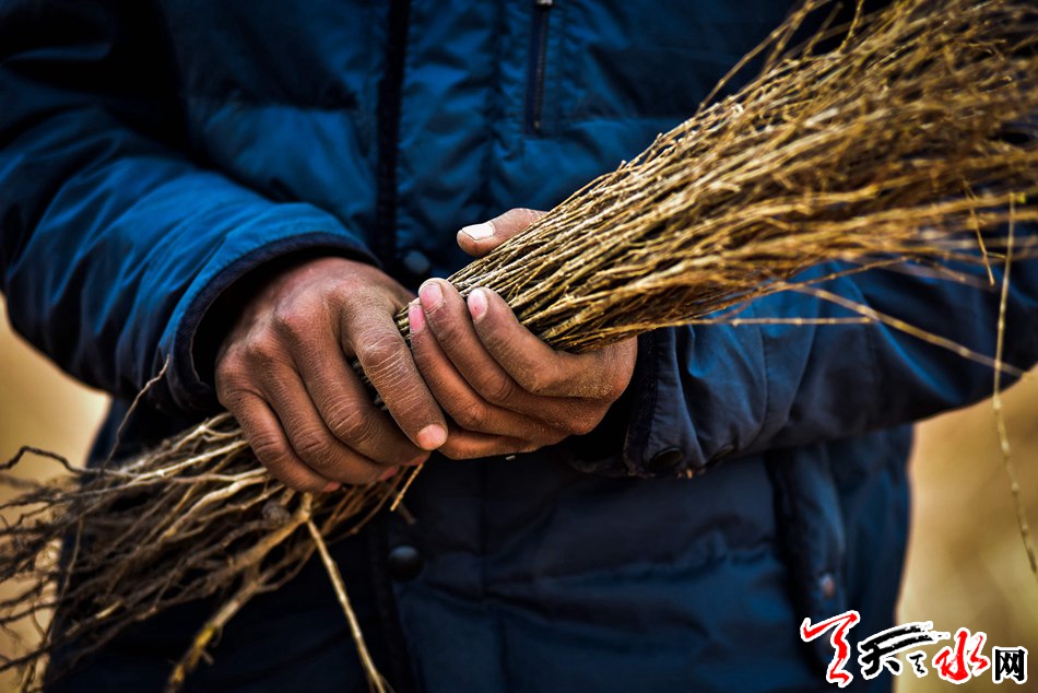33岁的第三代治沙人郭玺每天在治沙点忙碌,脸庞晒得焦黑,紧握着梭梭苗的一双手更显得粗糙。