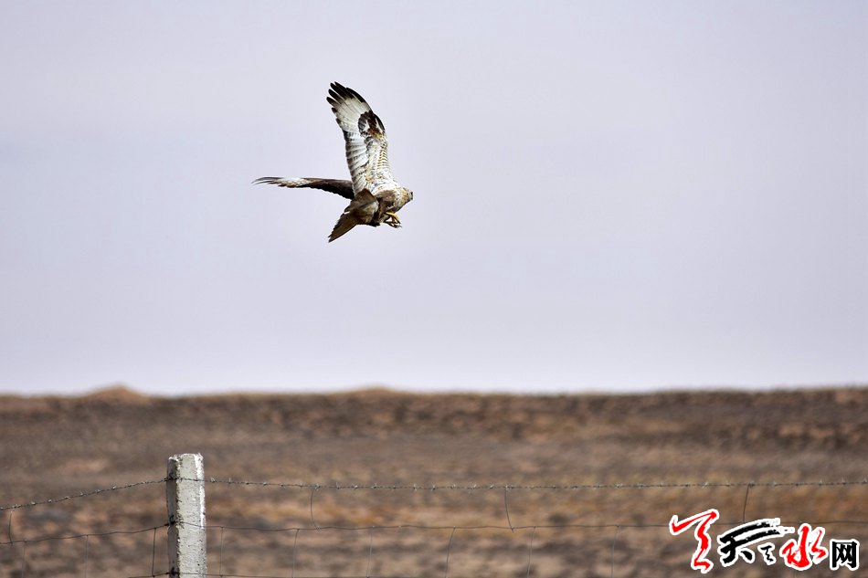 古浪县八道沟治沙点,一只雄鹰在飞翔。古浪,藏语意为黄羊出没的地方。近几年生态好转,黄羊偶尔可见,雄鹰、野兔等野生动物在沙漠中可以经常见到。