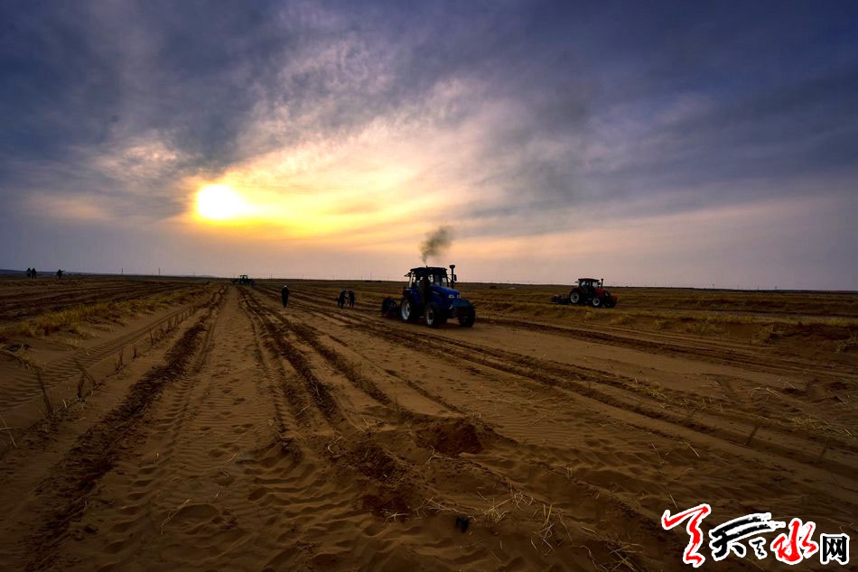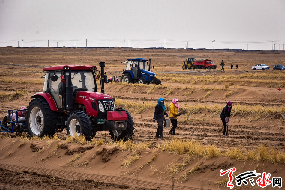在古浪县黄花滩移民区,八步沙第三代治沙人郭玺和村民用大型机械种植梭梭嫁接肉苁蓉。