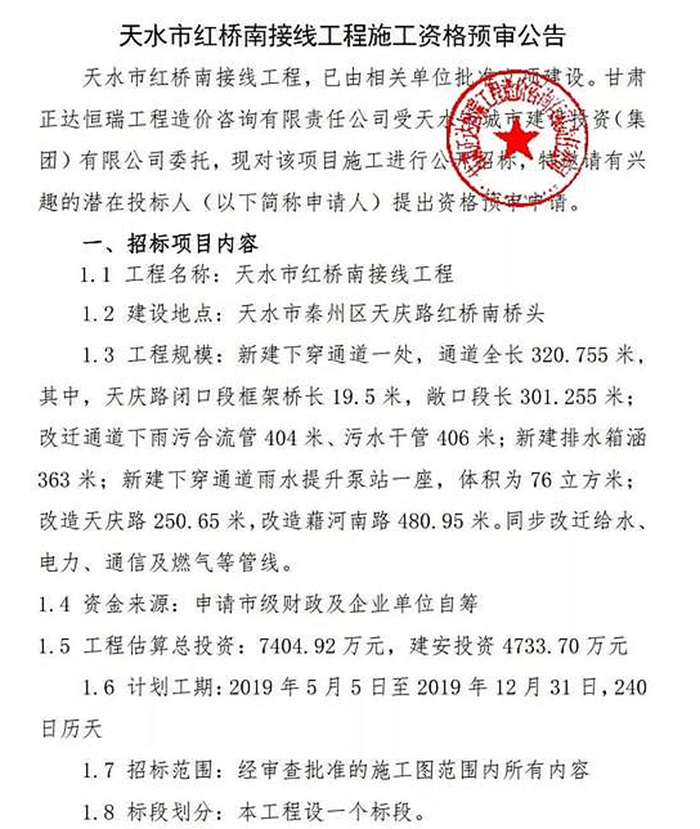 2019年4月9日,天水市红桥南接线工程施工资格预审公告发布,该工程建设地点为秦州区天庆路红桥南桥头,工程规模为新建下穿通道一处,通道全长320.755米。其中,天庆路闭口段框架桥长19.5米,敞口段长 301.255 米,改迁通道下雨污合流管 404 米、污水干管 406 米;新建排水箱涵363米,新建下穿通道雨水提升泵站一座,体积为76立方米。改造天庆路250.65米,改造藉河南路480.95米;同步改迁给水、电力、通信及燃气等管线。