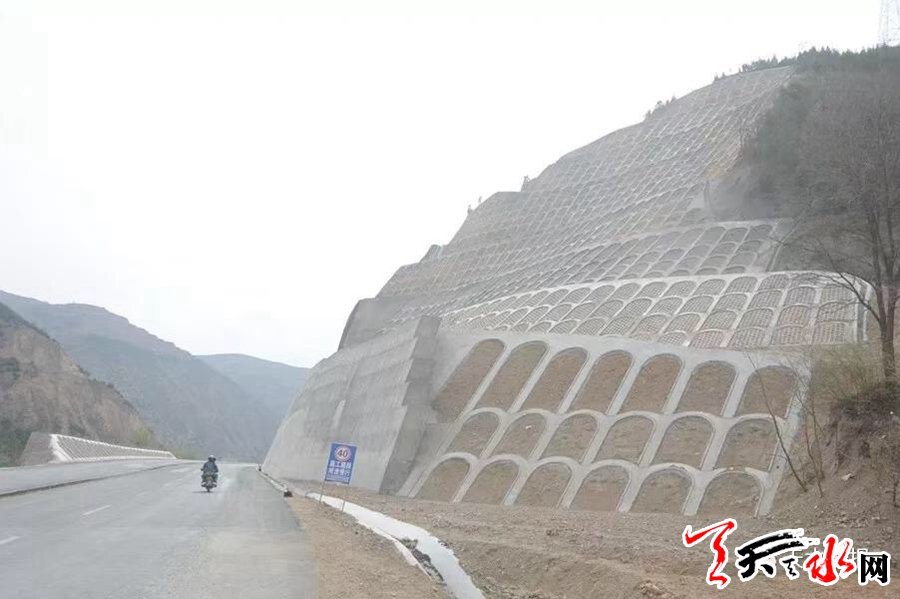 采访中记者看到,道路两旁凡是挖过土方的山坡都修建了网状的环保护坡,以防水土流失。