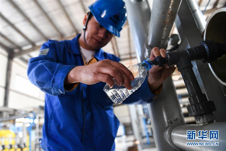 在国家能源集团鄂尔多斯煤制油分公司废水处理中心,一名工作人员展示经过处理后的污水(4月11日摄)。新华社记者 刘磊 摄