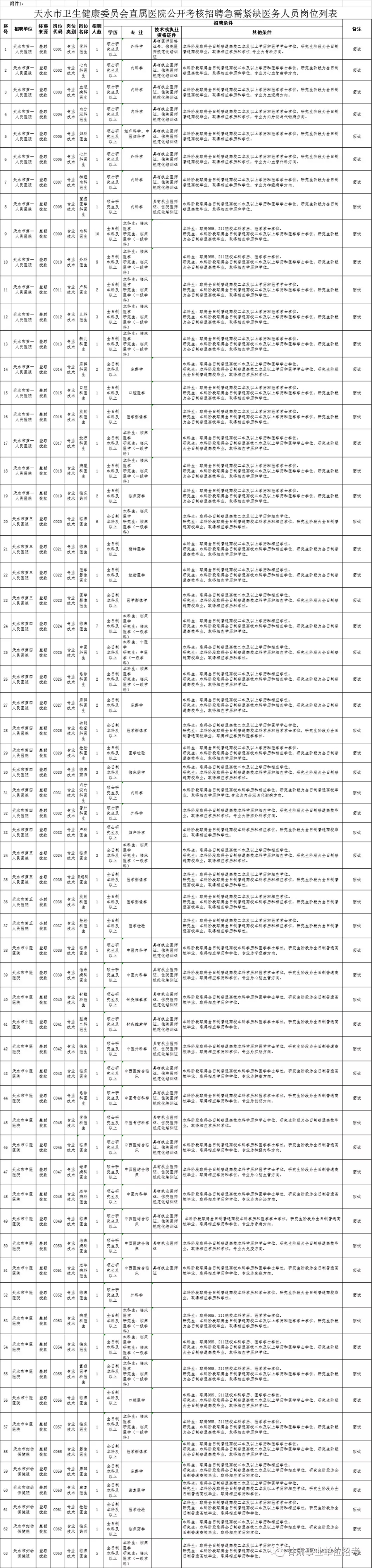 根据中共天水市委《关于深化人才发展体制机制改革的实施意见》(市委发〔2016〕51号),天水市委办公室、市政府办公室《天水市事业单位公开招聘人员实施办法》(市委办发〔2014〕68号),中共天水市委组织部、天水市人力资源和社会保障局《关于深化人才引进“放管服”改革的通知》(天人社发〔2019〕112号)等文件精神,现将天水市卫生健康委员会直属医院公开考核招聘急需紧缺岗位医务人员有关事宜公告如下: