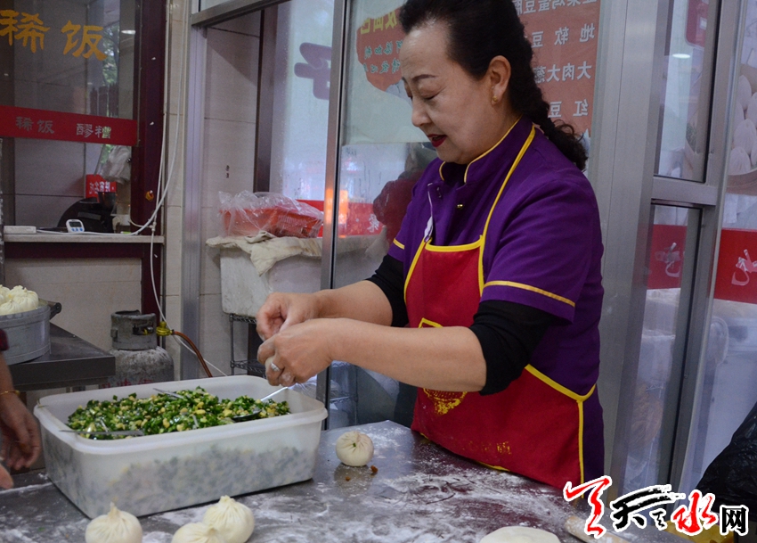 寂静中厨房里的声音显得很清脆,时间一分一秒在走,包子已经上了蒸笼。刘秀兰告诉记者,每天最早一批客人是七点左右到,所以在这之前她们得做好所有工作。蒸笼里压抑许久的诱人香味和腾腾热气随着开笼一瞬间全部涌向店铺,时间也刚过七点。上班路过的人已经站在门口买包子,时间充裕的顾客,会进来坐下喝碗粥,他们大多是老顾客,基本每天都会来吃早餐,比上班还要准时。