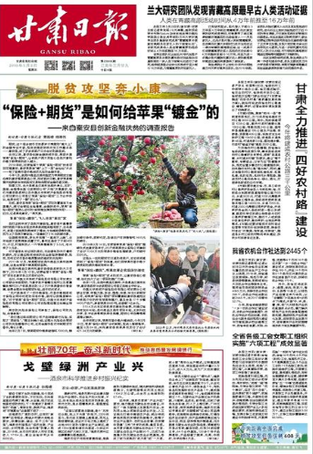 2018年3月14日,甘肃首单苹果“保险+期货”理赔仪式在秦安县举行,20户贫困果农从保险公司拿到了总计10.64万元的苹果价格保险理赔款,户均赔付5320元。