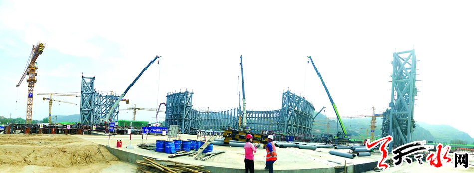 一踏入工地大门,忙碌的施工景象展现在记者眼前:一辆辆满载建筑材料的工程车不断驶入;在工地门口的左侧,几位焊工正在认真的分切钢筋;正前方20多米高的钢结构立柱上,焊接工人正在进行高空焊接工作,一团团焊花飞溅而下;再往后走,钢筋工们正在进行钢筋绑扎……在炎炎烈日下,工人们进行着有条不紊的施工,整个施工现场紧张忙碌、机械轰鸣。
