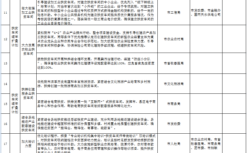 9.结合易地搬迁产业配套建设扶贫车间。紧密结合易地扶贫搬迁后续脱贫产业建设,选择有产业基础、企业意愿、市场前景、劳动力保障的集中安置点,充分利用易地搬迁建设结余资金、易地搬迁建设中超面积标准的部分房屋和乡镇、村闲置土地房屋创建扶贫车间,确保搬迁贫困户“搬得出、稳得住、有事做、能致富”。(各县区人民政府,市发改委)