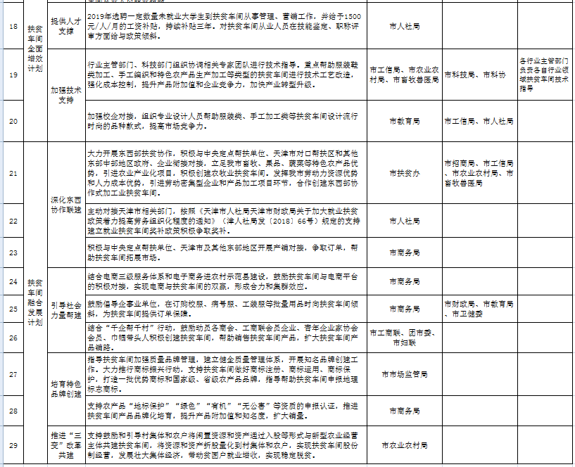 13.深化东西协作联建。大力开展东西部扶贫协作,积极与中央定点帮扶单位、天津市对口帮扶区和其他东部中部地区政府、企业衔接对接,立足我市畜牧、果品、蔬菜等特色农产品优势,引进农业产业化项目,积极创建农牧业扶贫车间。发挥我市劳动力资源优势和人力成本优势,引进劳动密集型企业和产品加工项目环节,合作创建东西部协作式加工业扶贫车间。主动对接天津市相关部门,按照《天津市人社局天津市财政局关于加大就业扶贫政策着力提高劳务组织化程度的通知》(津人社局发〔2018〕66号)规定的支持建立就业扶贫车间奖补政策积极争取奖补。积极与中央定点帮扶单位、天津市及其他东部地区开展产销对接,争取订单,帮助扶贫车间拓展市场。(各县区人民政府,市扶贫办、市招商局、市工信局、市农业农村局、市畜牧兽医局、市商务局、市人社局、市财政局)