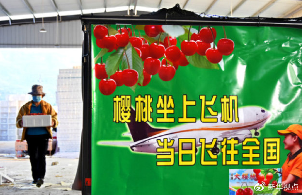 山东省沂源县历山街道北大岩村,一名果农搬运准备航运外销的大樱桃。 新华社发(赵东山 摄)