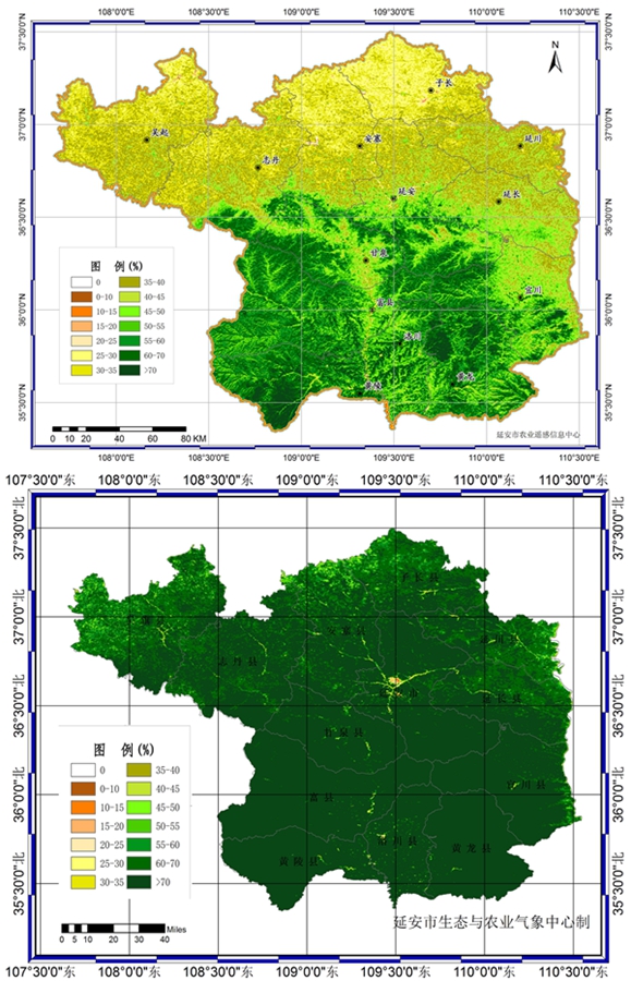 这是一张拼版照片:上图为2000年延安市遥感植被覆盖度图;下图为2018年延安市遥感植被覆盖度图。 新华社记者 刘潇 摄