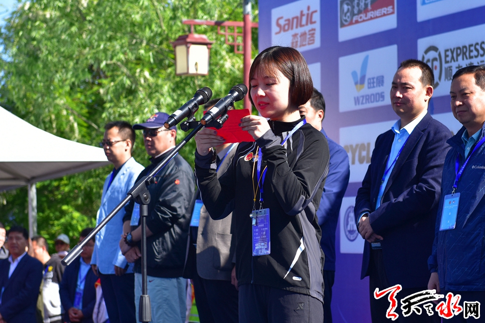 开赛仪式上2018年中国山地自行车公开赛(甘肃·天水·麦积站)大学生组冠军梁世重代表全体运动员宣誓;国家一级自行车裁判员樊馨霞代表全体裁判员宣誓。