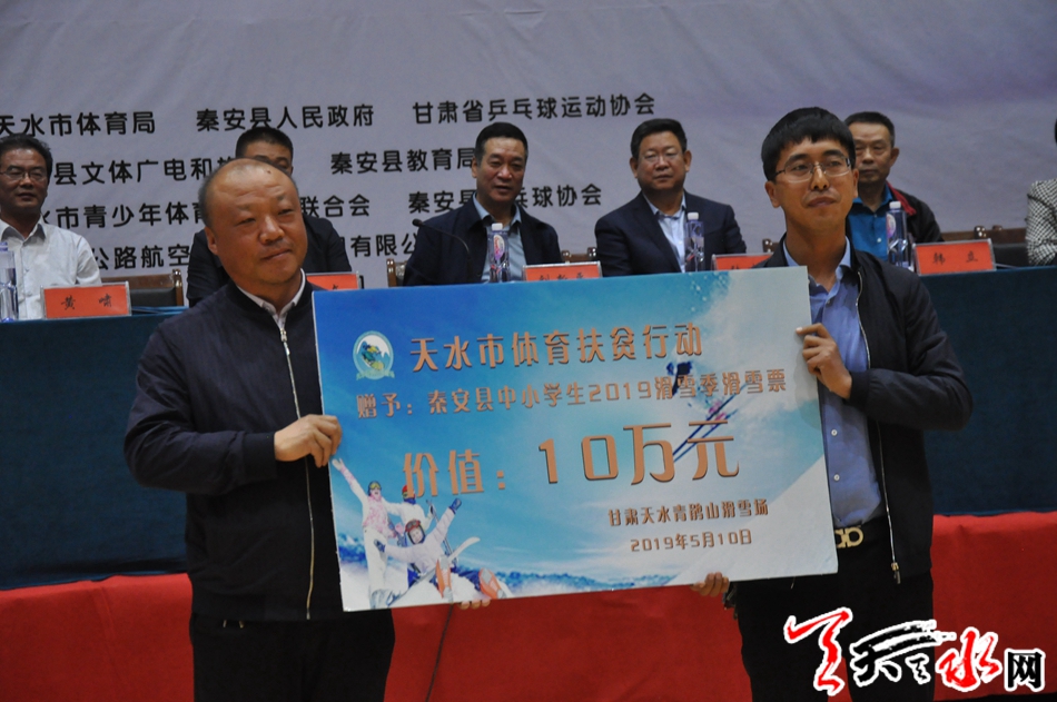 在开幕仪式上,天水市体育局向秦安县叶堡镇捐赠体育器材并宣布了甘肃省体育扶贫重点项目天水市入选项目名单,甘肃天麟集团和天水青鹃山滑雪场分别秦安县叶堡镇王家沟村民和秦安县中小学生捐赠了助学金和价值10万元的2019滑雪季门票。