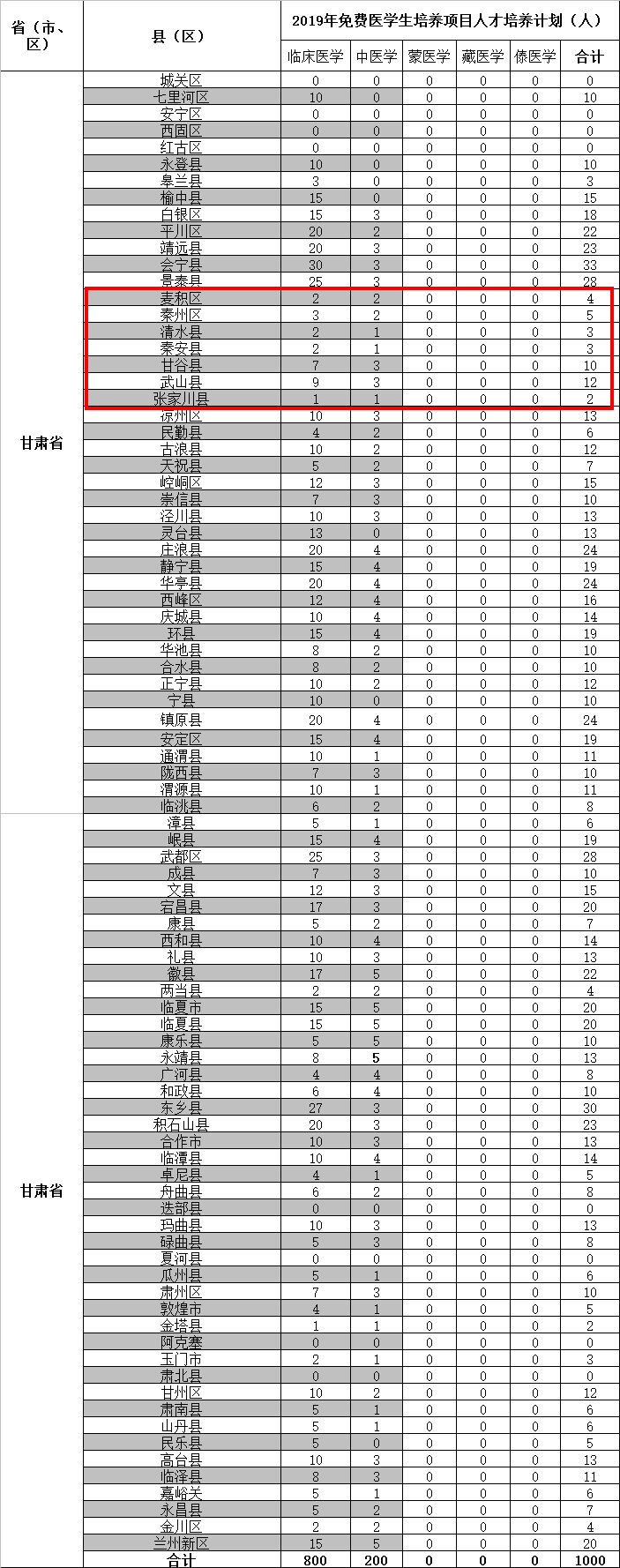 天天天水网讯 根据教育部5月10日发布的2019年中央财政支持的中西部地区农村订单定向免费本科医学生招生培养工作的通知,今年继续实施农村订单定向医学生免费培养,2019年中央财政支持高等医学院校为中西部乡镇卫生院培养订单定向免费五年制本科医学生共计6700人。其中甘肃省1000人(临床医学800人,中医学200人),天水市39人(临床医学26人,中医学13人)。