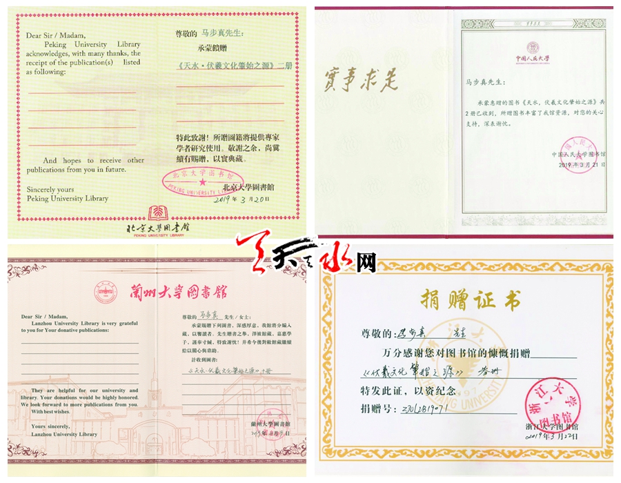 近日,由天水建筑设计院院长马步真编撰的《天水·伏羲文化肇始之源》一书被国家图书馆收藏。2018年10月,该书由甘肃人民出版社出版发行,一经面世,引起了社会各界特别是伏羲文化研究界的强烈反响。目前,该书已被国家图书馆、南京图书馆及北京大学、中国人民大学、北京师范大学、上海大学、复旦大学、兰州大学、兰州交通大学等多所高等学府图书馆收藏,并被列为馆配图书。