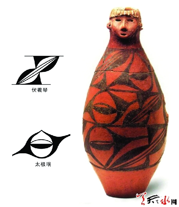 该书从大地湾出土的彩陶中,破译了人头形器口彩陶平底瓶表面的主题图案,该图案就是一个太极八卦,眼睛就是一个太极,古琴就是一个八卦,故被命名为“太极眼”“伏羲琴”。其鲜明地反映出绘画者具有浓厚的太极八卦意识,体现了绘画者较高的文化素养,同时反映出当时较高的社会文明化程度。该图案充分说明,在5500年前,生活在大地湾的先民已普遍存在太极意识和八卦思维。
