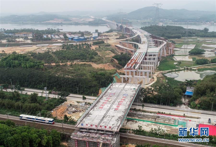4月2日,由广东省交通集团投资建设、中铁四局承建的汕(头)湛(江)高速公路北江特大桥跨京广铁路、国道G240转体桥成功转体,这是转体桥转体后的位置(无人机拍摄)。 新华社记者 刘大伟 摄