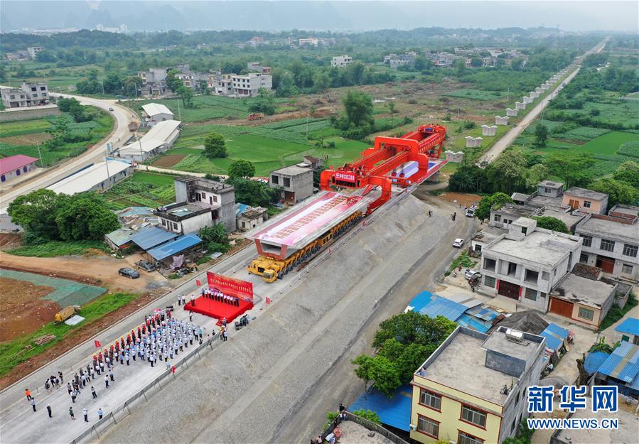在广西都安瑶族自治县贵南高铁澄江双线特大桥施工现场,工人在架设大桥首榀箱梁(4月29日无人机拍摄)。 新华社记者 陆波岸 摄