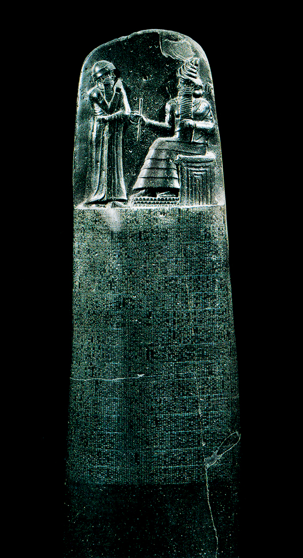 《汉穆拉比法典》是古代两河流域文明的象征。这座在公元前18世纪建造的玄武岩石碑,上端有汉穆拉比从太阳神沙马什手中接受权杖的浮雕像,下面用楔形文字铭刻法典全文。法典除序言和结语外,计有3500行、282条,包括诉讼手续,财产权,损害赔偿,租佃关系,债权债务,婚姻家庭,继承以及买卖奴隶等内容,是迄今世界上完整保存下来的最早的一部法典。图为现藏于法国巴黎卢浮宫的《汉穆拉比法典》。