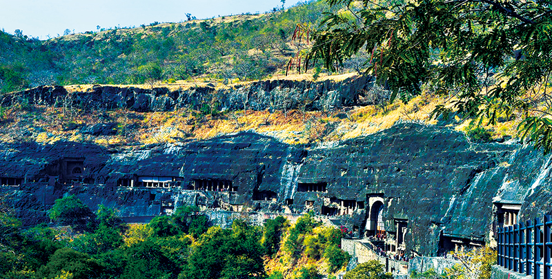印度阿旃陀石窟凿于一处马蹄形暗色岩陡崖上,其形成年代主要分为两个时期:公元前2世纪至公元前1世纪和公元5至6世纪。它集古代建筑、雕刻、绘画之大成,融佛教信仰、文化变迁、社会生活于一体,既具有极高的艺术价值,又饱含深厚的历史底蕴。图为在印度马哈拉施特拉邦拍摄的阿旃陀石窟外景。 新华社记者 张迺杰/摄