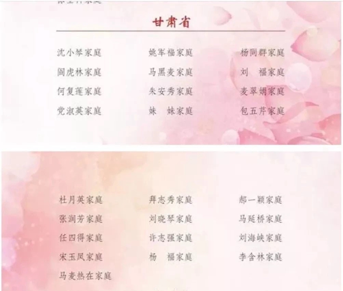 天天天水网讯 5月15日国际家庭日到来之际,全国妇联在京召开“家家幸福安康工程”启动部署暨2019年度全国最美家庭揭晓会。我市秦州区刘海峡家庭、阎虎林家庭、清水县麦翠娟家庭荣获2019年度“全国最美家庭”。自此,我市荣获“全国最美家庭”殊荣的家庭增至7个。